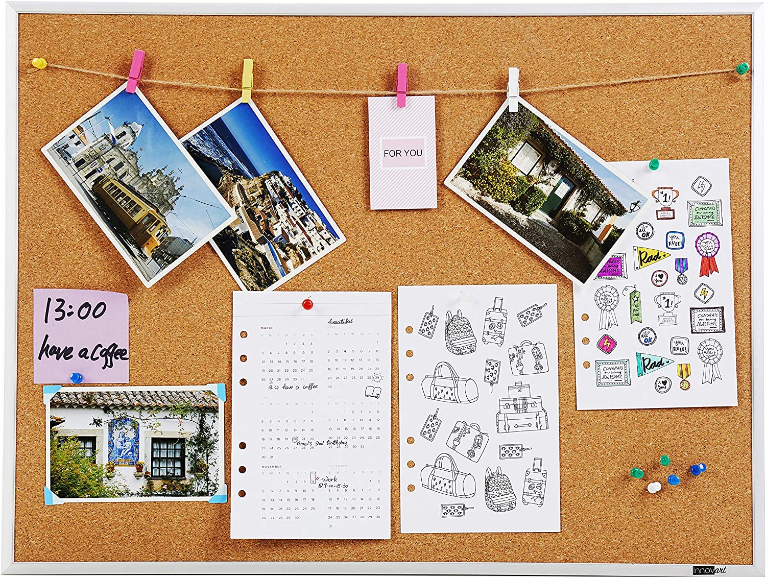 A corkboard is a display surface, normally brown, that offers space for organising display of notes, pictures and other relevant materials on it. Each corkboard is either framed with a wooden or aluminium frame depending on the size of the corkboard. Larger one will need to use aluminium frame for strength and durability. The modern corkboard allows one to use map pin/sewing pin to pin down notes, pictures, photos etc onto it.